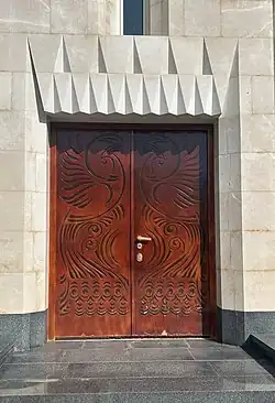 It is built of both Armenian granite and Iranian marble.[3] The temple is 25 metres high and consists of seven domes surrounding a central, arched roof, and houses a seminary and museum. The temple is dedicated to the angel Melek Taus and the Seven Angels of Yazidi theology. Malak-Tawus is the most important character of the Yazidi Holy Triad. He dominates all major and minor divinities of the pantheon. Malak-Tawus is, in fact, the essence, the raison d'etre, of the religion of the Yazidis. In a variant of the Yazidi Symbol of Faith he is featured directly after Xwade.[4]