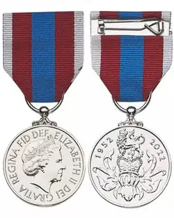 The Queen Elizabeth II Platinum Jubilee Medal (French: Médaille du jubilé de platine de la reine Elizabeth II[4]) or the Queen's Platinum Jubilee Medal is a commemorative medal created in 2022 to mark the 70th anniversary of Queen Elizabeth II's accession in 1952.