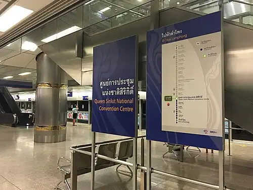 Queen Sirikit National Convention Centre MRT station (Thai: สถานีศูนย์การประชุมแห่งชาติสิริกิติ์, RTGS: Sathani Sun Kanprachum Haeng Chat Sirikit, code BL23) or QSNCC station is a Bangkok MRT station on the Blue Line, in Bangkok, Thailand. Located under Ratchadaphisek Road, near Queen Sirikit National Convention Centre, Benjakitti Park, PAT Stadium and Khlong Toei Market.