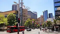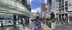 The changes included further improvements to pedestrian facilities, with the total footpath area increasing by 20% to almost 14,000 m2,[24] and longer traffic signal phases for pedestrians, while three new signalised pedestrian crossings were introduced mid-block, at accident 'black spots'. Also undertaken was a reduction of on-street parking spaces from 81 to 51, part of the prioritisation for pedestrians. The remaining spaces became dedicated short-term parking (i.e. drop-offs, loading). Not included in the design were dedicated bus bays, noted as a serious oversight by some critics, causing potential delays on the proposed bus lanes.[18][23][25]