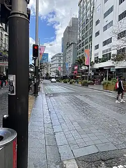 The 2006–2008 project repeatedly increased in cost, from NZ$23 million to around NZ$43.5 million, with some aspects (such as an improved entrance to Myers Park) falling victim to the blowout.[20] While Council noted in June 2007 that progress had often been quicker than expected,[21] the cost overruns, and the long duration of the construction works – which substantially affected pedestrian and motor vehicle traffic as well as retail sales[22] – made the upgrade unpopular in public, at least during the duration. It also became a problem issue for Dick Hubbard in his failed campaign for re-election to Mayor of Auckland in 2007. The upgrade is now considered to have generally been a success, and it won the 2009 Urban Design Award of the New Zealand Institute of Architects, which commended it for creating a quality public realm and sense of place.[17]