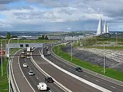 Junction 1a provides access from the M9 to the Forth Road Bridge and Queensferry Crossing via the M9 Spur, which was renumbered as M90 upon completion of the Queensferry Crossing. Originally, only east-facing connections were provided to the M9, forcing traffic heading west from the bridge onto the A904 through the village of Newton in West Lothian. The upgrade of the junction included new west-facing slip roads, enabling direct access onto the M9 from the Forth Road Bridge and the new crossing, as well as the widening of the existing connections to assist the flow of traffic at peak times.[62] The improvements were completed in February 2013 at a cost of £25.6m.[63] The junction connecting the A90 / M90 at the southern end of the bridges with the A90 towards Edinburgh city centre and the M90 extension is named the Scotstoun Junction and is numbered as Junction 1 of the M90.[59]