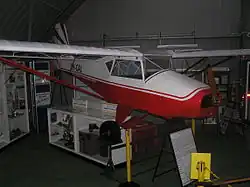 As a tribute to the local aircraft producer Calair Corp / Skyfox Aviation the museum has a major display, which features a CA21 Skyfox aircraft representing the prototype VH-CAL. This aircraft is restored using parts from several Skyfox aircraft with the wing being from the original aircraft.[10] Calair Corporation was created in October 1989 to produce a derivative of the Denny Kitfox at Caloundra Airport. The aircraft, to be known as the Calair CA21 Skyfox, was a two-seat high-wing monoplane with a tail wheel undercarriage for use in the training and recreational flying market. A number of changes were made to the Kitfox design to increase the loaded weight, which brought it up to the Australian CAO 101-55 standard. This allowed it to be commercial produced and be used for general aviation pilot training and it was the first aircraft in Australia to be so certified. It was powered by a 2.1L, 58.2 kW (78 hp) Aeropower engine built in Perth, Western Australia, which was essentially a Volkswagen adaptation. 33 CA21s were produced between July 1990 and August 1991.