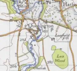 "QUENINGTON, a village and a parish in Cirencester district, Gloucester. The village stands on the Fosseway and the river Coln, 2 miles N. of Fairford, and 8 E. by N. of Cirencester"[7]