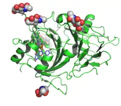 ![]() Crystal structure of quercetin 2,3-dioxygenase from pdb entry 1H1I with quercetin and copper. | |||||||||