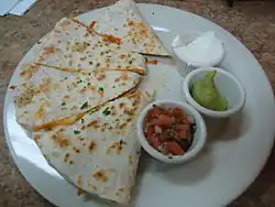 A quesadilla (/ˌkeɪsəˈdiːjə/; Spanish: [kesaˈðiʝa] ⓘ; Spanish diminutive of quesada[1][2]) is a Mexican dish consisting of a tortilla that is filled primarily with cheese (queso), and sometimes meats, spices, and other fillings, and then cooked on a griddle or stove.[3] Traditionally, a corn tortilla is used, but it can also be made with a flour tortilla.