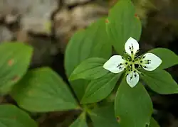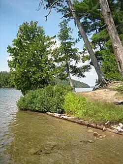 White pine is a common tree in the area, these trees are home to bald eagles and other large birds. Another tree that can be found is the red pine. Red pines are different from white pines in that the red pine has long clusters of two needles with red bark. The white pine has clusters of five soft thin needles. Other trees include cedar, birch, trembling aspen, red osier dogwood and many others. Because of all the wet marsh areas, there are many wetlands in Quetico. Labrador Tea is a shrub that can be found in some of these wetlands. Labrador Tea has a leathery texture with a soft green color. This plant was commonly used by Native Americans and Voyageurs for tobacco and tea. Bunchberry plants have four or six leaves. The plant has white flowers in the spring and red berries in the summer. Although there are many plants in the park with berries, it is important to learn which berries are edible before eating them.[12]