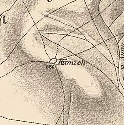 In 1882, the PEF's Survey of Western Palestine described the village of Qumya as located being located on a knoll in the middle of a valley, surrounded by gardens of prickly pear.[10]