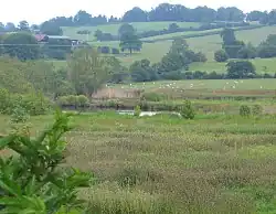 Quoisley Meres lie on the Cheshire Plain, near the boundary with Shropshire, at an average elevation of around 75 metres.[1] In common with the majority of meres in the Meres and Mosses natural area, they probably represent glacial kettle holes, formed at the end of the last ice age, some ten or fifteen thousand years ago.[2][3][4] The meres are located immediately south of the track from Wirswall Road to Mere Farm, around ¾ mile west of the village of Marbury; the nearest town is Whitchurch, around 2½ miles to the south. There are two meres; the larger, Quoisley Big Mere, is at SJ546455, and the smaller, Quoisley Little Mere, at SJ549455. A narrow strip of woodland, Holly Rough, lines the farm track immediately to the north of Little Mere.[1] The catchment area of the meres is 136 hectares (340 acres).[5]