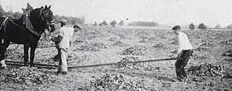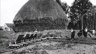 Around 1881, sugar beet producer Arthur Brandin invested in a Decauville railway with eight horse-drawn tipping lorries for the Ferme de Galande near Réau, 15 km east of the Decauville factory in Petit Bourg. As well as being a sugar beet farmer, he was also mayor of Réau and Republican Consul of the Canton of Brie-Comte-Robert from 1895 to 1912. The surface soil of his sugar beet fields consisted of clay in which fragments of siliceous sandstone were embedded, used for millstones and structural purposes. The subsoil was limestone, so the fields were often very muddy at harvest time until Brandin installed an innovatively designed drainage system.[4]