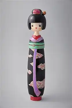 The dolls, turned and carved from wood, embody the Japanese ideal of feminine beauty with their clean shapes: neat black hair, a charming, gentle white face and a body dressed in closed, decorated kimonos. Their decoration and painted patterns are often linked to the seasons. There is hardly a Japanese household without at least one kokeshi. In terms of shape, there are smaller and larger figures of girls, cylindrical and spherical, samurai, monks and many others with features specific to the region from where the kokeshi originates.[7]