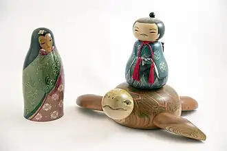 In 2015, she became the first foreigner to compete in the 57th Japanese National Kokeshi Competition, and was awarded the Governor of Miyagi Prefecture Award for her doll Kaguja hime.[8] In 2016, she was the first foreigner to compete in the 58th Japanese National Kokeshi Competition. She was the only foreigner to compete for the second time in the 58th Japanese National Kokeshi Competition, winning the grand prize in the creative category, the Japanese Minister of Economy, Trade and Industry's award for her work entitled "Dress-up Kokeshi - with a Wardrobe."[9] In addition to the perfect execution of the winning work, her creativity also attracted the attention of the jury. In addition to the kokeshi doll, the piece, made of hornbeam, beech and ashwood, includes a wardrobe with 17 meticulously crafted accessories such as kimonos, hats, umbrellas, lanterns and fans. The idea that a kokeshi doll can be dressed in different outfits and accessories to suit the season and the occasion is quite unique.[10] She was the first foreigner to get near to the closed cultural circle of Japanese Kokeshi making masters. She was welcomed and allowed closer to their professional knowledge and workshops techniques, which, according to Jennifer McDowell, an American kokeshi sociologist, as a woman, as a foreigner in a massively constructed masculine system, "can be seen as breaking through an anthropological wall."[1]