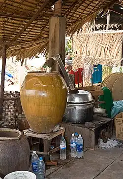 Rượu đế is a distilled liquor from Vietnam, made of either glutinous or non-glutinous rice. It was formerly made illegally and is thus similar to moonshine. It is popular in the Mekong Delta region of southwestern Vietnam (its equivalent in northern Vietnam is called rượu quốc lủi). Its strength varies, but is typically 40 percent alcohol by volume. It is usually clear, and a bit cloudy in appearance.
