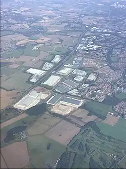 The site of RAF Burtonwood, 2024. The overlay of the M62 Motorway across the former east-west runway can be clearly seen.