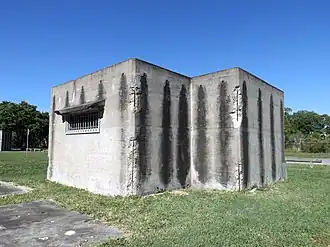 The control hut is made of concrete 12 inches (300 mm) thick and is approximately 19 by 22 feet (5.8 by 6.7 m). It stands close to the park edge at Boggy Creek, aligned southwest-northeast. The rectangular plan is divided into even quarters with three enclosed rooms and an open entry courtyard in the southwest quarter. There are two doorways off the open courtyard, protected by a freestanding blast wall. The door to the northwest opens into a fully enclosed room (former workshop and store) which connects to a room to the northeast (former indicator loop room). The storeroom contains an uninstalled louvered timber door, leant up against the wall. The indicator loop room has a single narrow unglazed observation window at eye height on the northeast corner. This narrow opening is sheltered by an external cantilevered tapered concrete hood.[1]