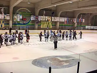Prior to the existence of the League, some collegial teams played with university teams in the Quebec University Women's Hockey League (QSSF).[3][4][5] The first-ever Canadian Interuniversity Athletic Union (CIAU) National title for women's ice hockey was held at the end of the 1997-98 CIAU season and two Québécois college teams participated at the tournament:[6] Cégep St-Laurent[7] and Collège Jean-de-Brébeuf. The Ligue de hockey féminin collégial AA was founded in 1999 to provide opportunities for young females to develop into collegiate student-athletes. It was developed to bring together teams that regularly produce players for competition at the Canadian Interuniversity Sport women's ice hockey championship and NCAA National Collegiate Women's Ice Hockey Championship levels, respectively. The inaugural season was in 1999-2000, and the Patriotes du collège St-Laurent won the Playoff Championship title.[8] A national championship for college athletics in Canada was approved at the advent of the 2001-02 season.