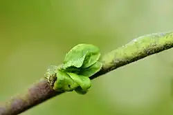The gall is a small rosette, most often in an axillary bud on sallows. In Britain sallow usually refers to S. aurita, S caprea, S. cinerea and the hybrids between these species. The rosette leaves are not obviously hairy and the full grown larva does not have a sternal spatula (i.e. a structure on the underside of the thorax of the final (third) instar larva of Cecidomyiidae).[1] Larvae of R. rosariella are unique as all other known Rabdophaga larvae have a sternal spatula.[2]