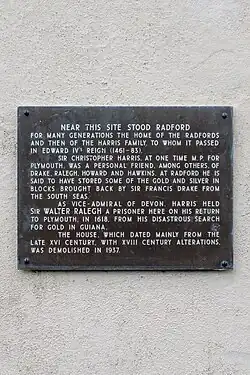 Sir Christopher Harris (c. 1553 – 1625) of Radford, son, a Member of Parliament for Plymouth in 1584, knighted in 1607. He was a close friend of Admiral Sir Frances Drake, who on one occasion lodged part of his captured treasure at Radford. In partnership with John Hele (died 1608) of Wembury in Devon, serjeant-at-law and MP, Harris acquired the estate of Buckland Abbey in Devon as a seat for Drake.[12] He owned the Armada Service, a set of 31 silver dishes now in the British Museum. He married Barbara Arscott (d.1597/8), a daughter of John Arscott of Dunsland in the parish of Bradford (or Cookbury) in Devon. His son John Harris died young and pre-deceased his father,[9] thus Radford passed to the closest living male descendant of his only sister Jane Harris, namely his great nephew John Harris (c. 1596 – 1648) of Lanrest in Cornwall, four times elected MP for Liskeard, Cornwall.
