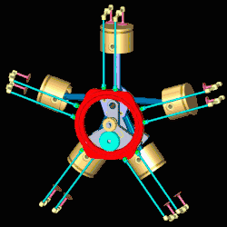 Pistons are in gold and valves in pink, master rod in pale purple, slaved connecting rods in blue, crankshaft / counterbalance in gray and timing ring and cams in red.