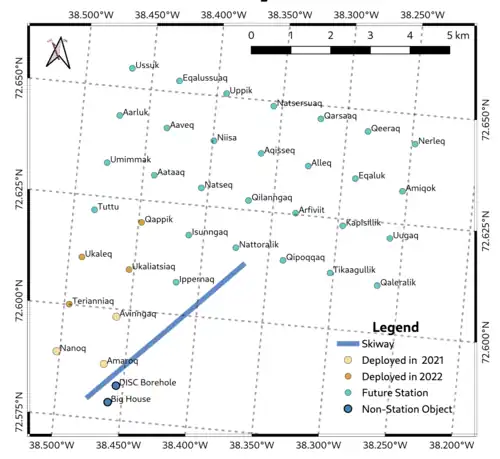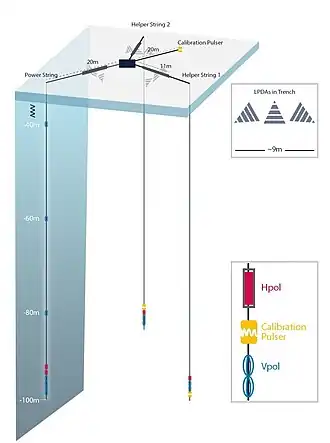 Located at 3,216 metres (10,551 ft) above sea level,[1] the detector array is planned to consist of 35 stations. By 2022 seven stations have been deployed and are taking data. Each station consists of three in-ice strings at 100m depth to measure particle cascades in ice induced by neutrinos and other particles and a surface component that is also sensitive to cosmic rays. The stations operate autonomous and are powered by renewable energies, such as solar panels and wind turbines. The communication is wireless via LTE.[2]