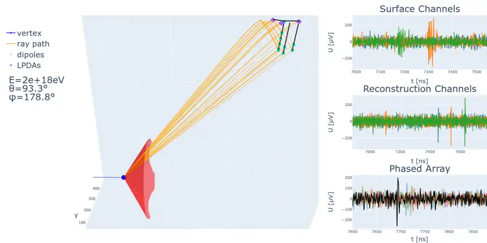 An event view from simulations for RNO-G. The neutrino induced particle cascade creates radio emission via the Askaryan effect. This is strongest at the Cherenkov angle at 56°, here shown as a red cone. The radio signal will propagate to the detector according to the ice density (direct and reflected). On the right shown are signals in the surface antennas (upper panel), the reconstruction antennas (middle) and the phased array trigger (lower panel).[3]