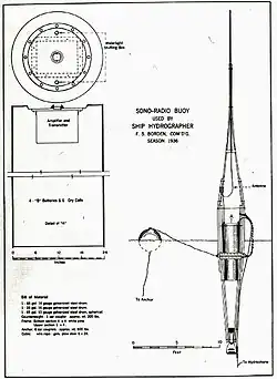Initially, Heck and others involved in the development of radio acoustic ranging thought the technique would prove least effective along the coast of the Pacific Northwest, where they assumed that the sound of wave action along the coast and the difficulty of setting up shore stations and cables would reduce the success of radio acoustic ranging; in contrast, they thought that conditions along the United States East Coast would pose no challenges. In fact, the opposite proved true: Among other problems, the relatively shallow water along the U.S. East Coast attenuated the sound of ranging explosions and shoals often blocked the sound from reaching shore at all. To overcome these difficulties, the Coast and Geodetic Survey anchored vessels well offshore along the U.S. East Coast to serve as hydrophone stations.[1] In 1931, the Coast and Geodetic Survey proposed replacing the manned station ships with "radio-sonobuoys", and in July 1936 it began to place radio-sonobuoys in service. The 700-pound (317.5-kg) buoys – equipped with subsurface hydrophones, batteries, and radio transmitters that automatically sent a radio signal when their hydrophones detected the sound of a ranging explosion – could be deployed or recovered by Coast and Geodetic Survey ships in five minutes.[1][5][6] Use of the buoys spread to the U.S. West Coast as well because they were cheaper to set up and operate than a shore station.[5]