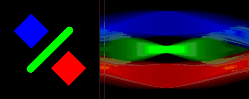 Horizontal projections through the shape result in an accumulated signal (middle bar). The sinogram on the right is generated by collecting many such projections as the shape rotates. Here, color is used to highlight which object is producing which part of the signal. Note how straight features, when aligned with the projection direction, result in stronger signals.