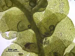 The leaves are bilobed (divided into two parts) and arranged in two rows along the stem. This bilobed leaf structure is one of several features shared with the related genus Porella, along with the dorso-ventrally compressed perianths, two-layered spore capsule walls, free elaters (specialised cells that help disperse spores), and spores with a distinctive echinate (spiny) surface pattern. The cells contain one or two large, brown oil bodies that typically occupy most of the cell space. A characteristic feature of the family is its relatively flat (dorso-ventrally compressed) perianths, which are protective structures surrounding the reproductive organs.[7]