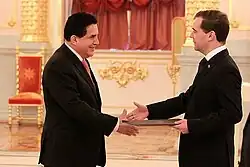 ![]() Ambassador Amador (left) presents his Letters of Credence to Russian President, Dmitry Medvedev (right), in 2011. | |