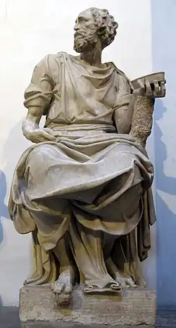 Shortly thereafter, according to Vasari, Raffaello began work in Florence with Michelangelo, at the Medici Chapel of the Basilica di San Lorenzo, for which he sculpted Saint Damian (c. 1534).[2] Saint Cosmas is also attributed to him, together with Giovanni Angelo Montorsoli, another assistant to Michelangelo.