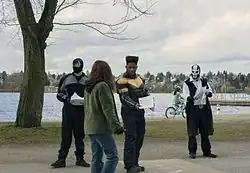 ![]() Members of the Rain City Superhero Movement passing out flyers with descriptions of a criminal in 2013 | |