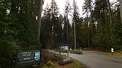 Due to the park's location on the Chehalis River, the site has experienced several floods and subsequent damages. The footbridge was nearly destroyed during a buildup of a log jam during the 1972 Lewis County Flood; the height of the log jam exceeded the top of the bridge.[10] In 2007, the park suffered severe flooding which destroyed the footbridge, other bridges along the Willapa Hills Trail, as well as the park's main entrance.[11] Damages were listed at $6.5 million and visitors began using an alternate entrance to the park in 2008.[12][13] The revised entrance was constructed at the location of the original CCC gateway and by 2011, the kitchen area and picnic areas, including playgrounds, were restored.[14]