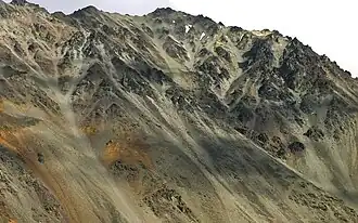 The mountain is so named because of multi-colored talus which slides down its face, and the descriptive toponym has been officially adopted by the United States Board on Geographic Names.[1] Yellow, pink, and green colors are from volcanic eruptions 300 to 350 million years ago, whereas brown and gray colors are from sandstone, siltstone and limestone layers. Minerals present include chrysocolla, serpentinite, hematite, chromite, quartz, calcite, pyrite, and malachite.[5] Rainbow Ridge is an excellent site for collecting fossils of trilobites which are about 315 million years old.[5]