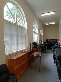 Alterations to Block C took place in 1984. These changes included enclosing the building's north verandahs by: inserting new timber-framed windows; demolishing the brick ground floor spandrel panels and replacing them with metal louvres; sealing behind the first floor concrete balusters; and adding a concrete screed on the verandah floors to raise them to match the internal floor level. The keyed brickwork on the west elevation, where planned extensions were to connect, was removed, plastered and painted over. To accommodate a school library on the ground floor, a suspended ceiling was inserted and partitions were added in the east classroom to form a workroom and store. On the first floor, the two classrooms were converted into a double teaching area by making a large opening in the partition and introducing an accordion door. Concrete block partitions were added to the first floor stair landing to make a storeroom.[71][72][73][1]