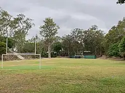 An important component of Queensland state schools was their grounds. The early and continuing commitment to play-based education, particularly in primary school, resulted in the provision of outdoor play space and sporting facilities, such as playing fields and tennis courts.[50] The Rainworth State School site was originally rough and hilly, with a creek running through the low-lying area at the southern end of the site. A level, open space to the north of Block A was utilised as a parade ground from the school's opening day.[51][52] Between 1928 and 1935, the school was fenced; steps were dug into the steep embankment behind the school buildings; and tennis courts, and a sporting field were levelled and laid out. The DPW provided a concrete cricket pitch, and concreting underneath the timber school buildings was completed. Tree stumps were removed using explosives during a working bee c. 1929. Relief workers cleared and levelled the playing field and excavated the site for the grass tennis courts during the 1929–30 financial year.[53][54] A concrete retaining wall and steps to Boundary Road and along the northern part of the eastern boundary, were constructed by the DPW using day labour, between July and September 1932. A 100-foot-long (30.5m) section of the wall collapsed in September 1932 after heavy rain, and was rebuilt in 1933.[55][56][57][58][1]