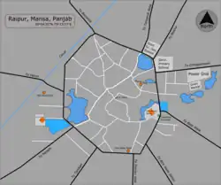 Raipur, having an average elevation of 212 metres (696 ft),[4] is approximately centered at 29°54′20″N 75°15′17″E / 29.90556°N 75.25472°E.[5] It is located in the development block of Jhunir in Mansa district of Indian Punjab. The city of Mansa lies to its northeast (21 km), the city and district of Bathinda to its northwest, Sardulgarh to its south (32 km) and the state capital city of Chandigarh to its far northeast (203 km). The historical city of Talwandi Sabo is just 21 km away in the northwest. It is linked directly to the 11 surrounding villages, Baje Wala, Bire Wala Jattan, Jherian Wali (Bishanpura), Tandian, Nangla, Peron, Behniwal, Bana Wala, Talwandi Aklia (Chhoti Talwandi), Makha and Chhapian Wali.[1]