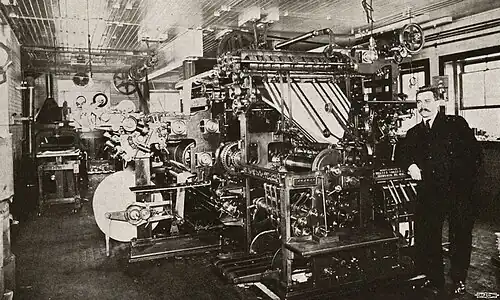 Web press used for the production of Raivaaja, 1915. Pictured next to the press is the pressman, Anton Victor Lehtonen (1880–1945.)