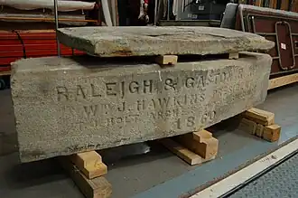 Cornerstone of the Raleigh and Gaston railroad building of Raleigh, North Carolina