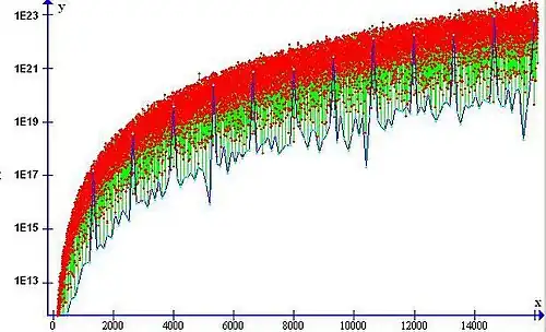 Values of for with a logarithmic scale. The blue line picks only the values of that are multiples of 121.