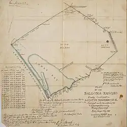 In 1857, Benjamin D. Wilson received title to one fourth of Rancho La Ballona on a foreclosure of a loan he had made to Tomas Talamantes in 1854. Wilson sold his portion of Rancho La Ballona to George A. Sanford and John D. Young, who in 1863 had petitioned for a division of the lower Ballona Valley land. A decree dividing it into 23 sections was issued in 1868.[8] Each of the 23 long narrow parcels was to have three types of land: "pasture", "irrigable"; and "bay" (Santa Monica Bay).[8] The largest allotment of the former rancho, on the bluff northwest of Ballona Valley to the boundary with Rancho San Vicente y Santa Monica, was to the "Estate of Augustin Machado", and by a later partition in 1875 this allotment was re-divided among the "Heirs of Augustin Machado".[8][9][10][11]