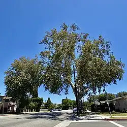 65-foot (20 m) tall, heavy-trunked native California sycamore (Platanus racemosa) on Inglewood Blvd, Del Rey, Los Angeles, six blocks from Ballona Creek