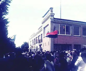 Polischuk and Rabinenko were detained on 30 June. Dryzhak, according to law enforcers, had an alibi – being on duty at the police department at the time of the crime.[1] This triggered protests by Vradiivka residents who demanded Dryzhak's immediate arrest.[1] Many of the protesters suspected that the policeman was being protected by local authorities because of family connections.[5][6] On 1 July 2013 more than 500 protesters stormed the Vradiivka Raion police department, demanding the police officers involved be prosecuted.[1][2] They smashed windows, broke doors and set fire to the building.[7] In return the police used tear gas against protesters, some of whom were covered in blood.[6] There were further demonstrations in Lviv, Donetsk, and near the Presidential Administration Building in Kyiv.[8][9][10][11][12]