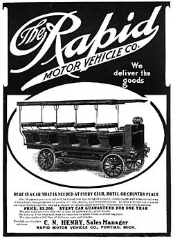 The Rapid Motor Vehicle Company was founded in 1902 in Pontiac, Michigan — by Grabowsky brothers, namely Max (1874–1946) and Morris (1870–1935) — whose earlier venture, Grabowsky Motor Vehicles Company had been founded in Detroit in 1900.[2] They went on to build one-ton trucks and were the beginning of GMC Truck division after they were acquired by General Motors in 1909.[3]