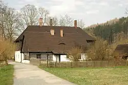 The Old Bleaching Ground (Staré bělidlo) is one of the best-known folk structures in the Czech Republic. The timber-frame cottage with a shingle roof was built in 1797 by the miller Antonín Ruder as a home for his grandparents. In 1842 it was bought along with the mill by the then owner of the estate, Prince J.W. Schaumburg-Lippe, who had a one-storeyed building containing a laundry and a pressing room built-on on to it.