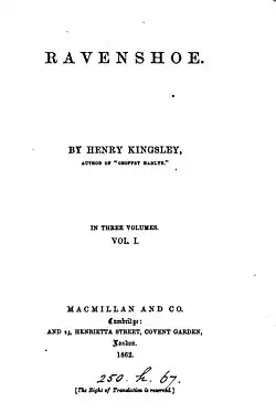 Ravenshoe is a novel by English author Henry Kingsley, published in 1862. It has been noted for the complexity of its three-part plot,[1] and for its description of the Charge of the Light Brigade, a failed military action during the Battle of Balaclava in the Crimean War.[2][3][4]