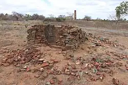 • Winding engine site – an assemblage of brick and concrete mounts with embedded metal fixtures, situated to the southwest of the shaft. The main brick winding mounts comprise four bays of red brick, with openings facing northeast. Additional mounts to the southeast are a combination of red brick and concrete render. A cylindrical metal boiler with riveted joins is situated to the south of the mounts.