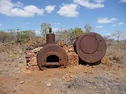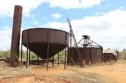 The Ravenswood Gold Mining Syndicate's (Judge's) mill initially consisted of 10 head of stamps obtained from the Mother Lode Mill at Mount Wright (northwest of Ravenswood), powered by a diesel engine. The ore was crushed by the stamper battery, concentrated with Wilfley tables, and then either treated with cyanide or sent to the Chillagoe smelters. Initial success with some rich ore led to enlargement of the mill to 30 stamps in 1939–1940.[14][147] The annual report for 1940 claimed the mill had been expanded to 30 head of stamps during 1940, but work was reportedly also underway on the expansion in late 1939.[148] A Stirling boiler and a 250 hp engine were also obtained from the Burdekin meatworks (Sellheim), and a rock breaker, elevator and conveyor were installed.[149] However, the upgraded mill proved to be overpowered and required a lot of timber fuel; the brick foundations used for the machinery were not strong enough; and the best ore from the Sunset had already been treated, so the mill closed early in 1942 and the plant was moved to Cloncurry.[1][29][150][151]