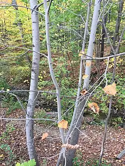 The forest cover of Ravine Park is dominated by a mixture of sugar maples, basswood, and red oaks. Various other species, including the highly invasive Norway maple, also account for some of the biomass. The undergrowth is dominated by plants such as Virginia bluebells, mayapple, and trillium. The American witch-hazel is also present in small quantities.[9]