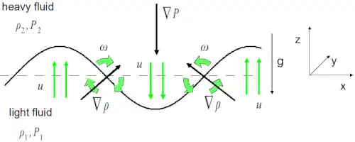 The RT instability can be seen as the result of baroclinic torque created by the misalignment of the pressure and density gradients at the perturbed interface, as described by the two-dimensional inviscid vorticity equation, , where ω is vorticity, ρ density and p is the pressure. In this case the dominant pressure gradient is hydrostatic, resulting from the acceleration.