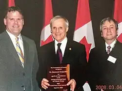 Desjardins (centre) receiving an award from the Canadian government, by John Baird to the left, for his work for the IPPC